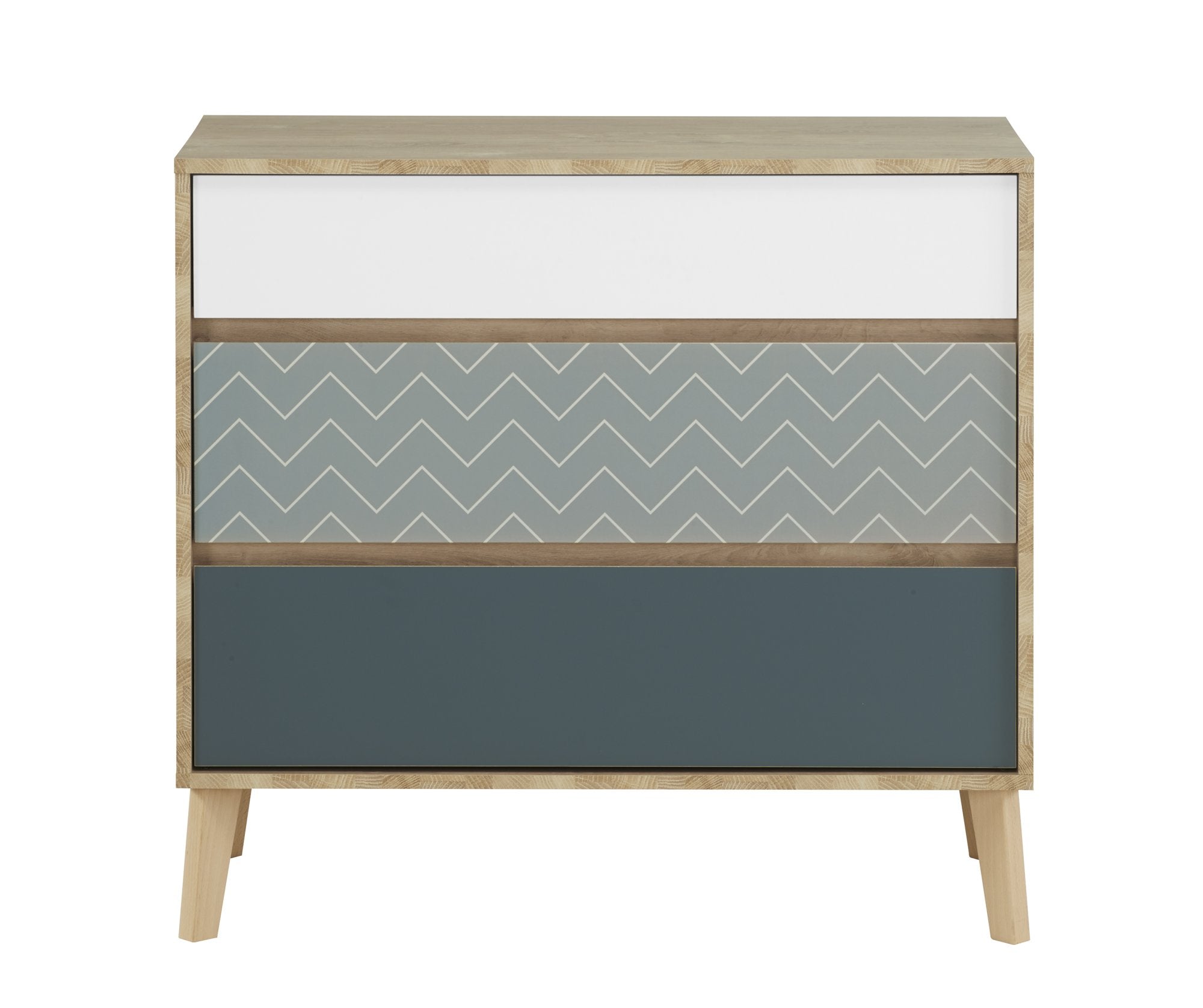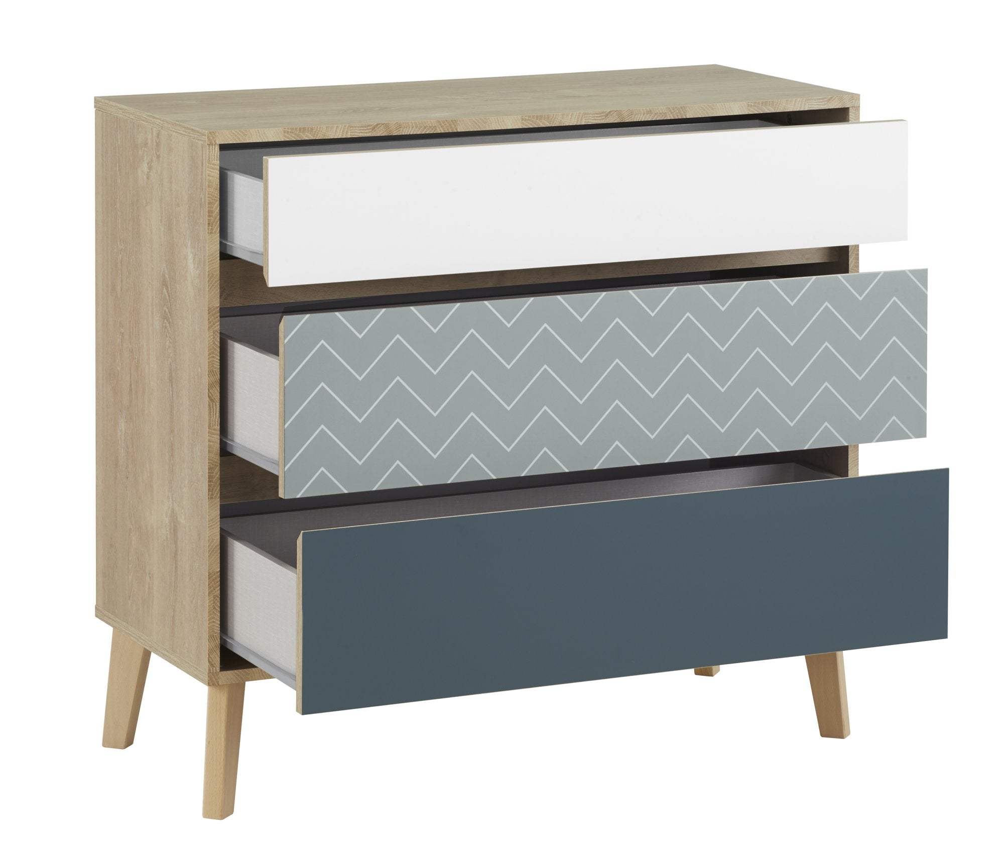 Avec ses façades en chêne blond, beige, blanc, sérigraphié et bleu, cette commode s'intègre parfaitement dans n'importe quelle pièce de votre maison.