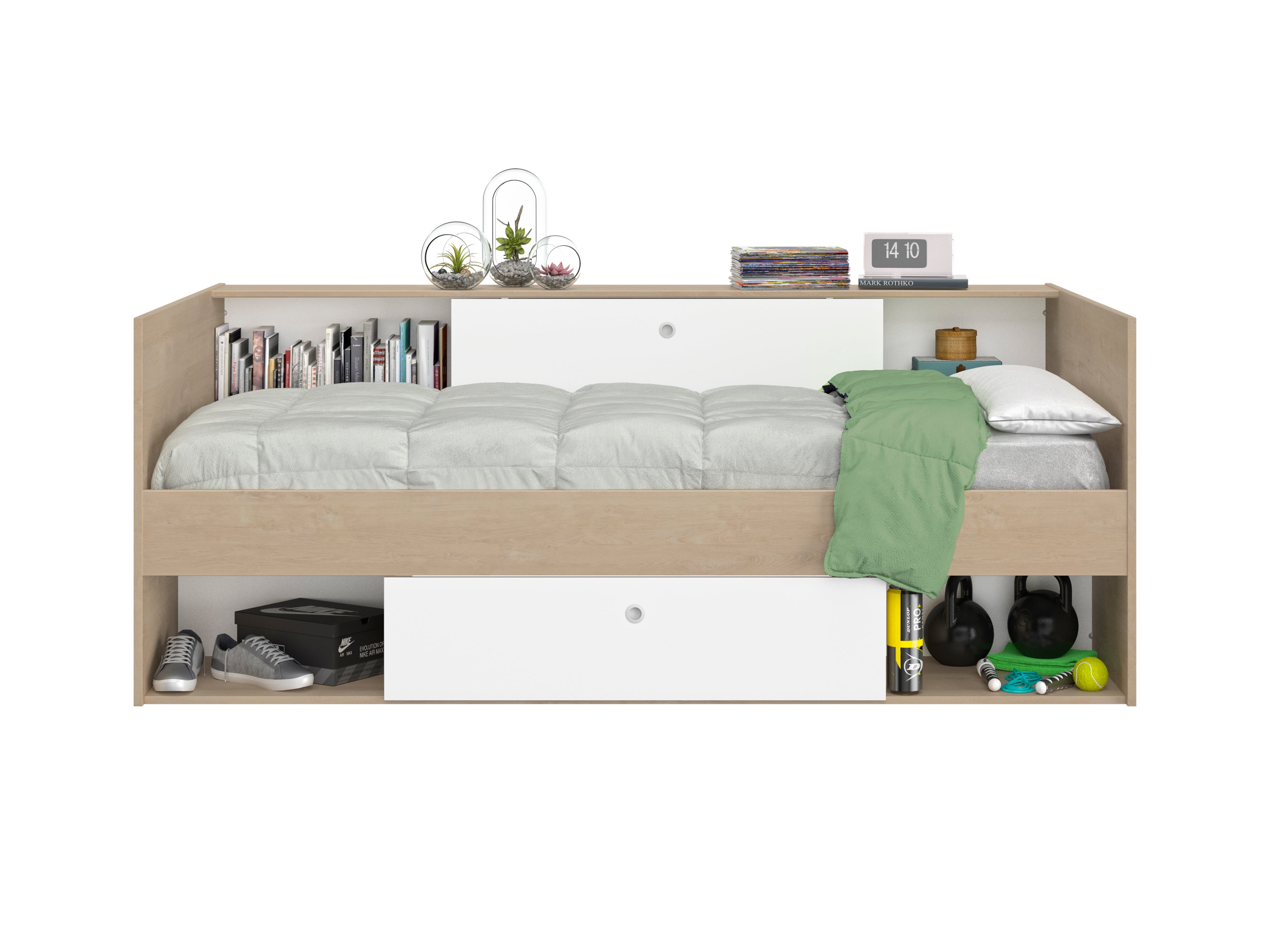 - Grand tiroir de rangement centré sous le lit, entouré de deux niches ouvertes.