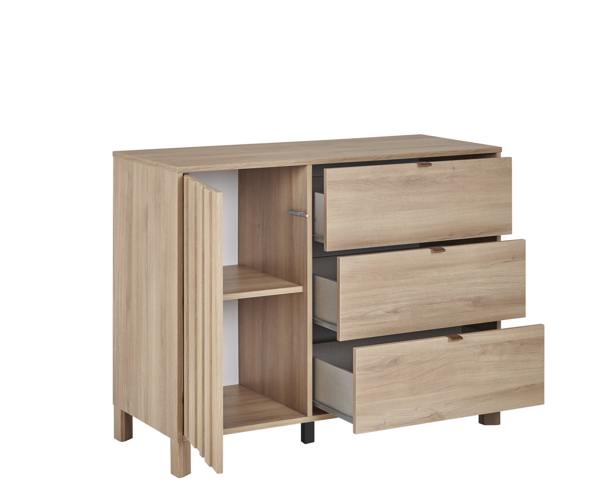 Découvrez la commode Calypso, un choix parfait pour la chambre de votre futur bébé. Avec son style naturel chic, elle apporte une ambiance douce et chaleureuse grâce à ses teintes chêne doré et son effet "claustra". Ce meuble spacieux est idéal pour ranger tous les essentiels de votre bébé : vêtements, couches, jouets, etc.