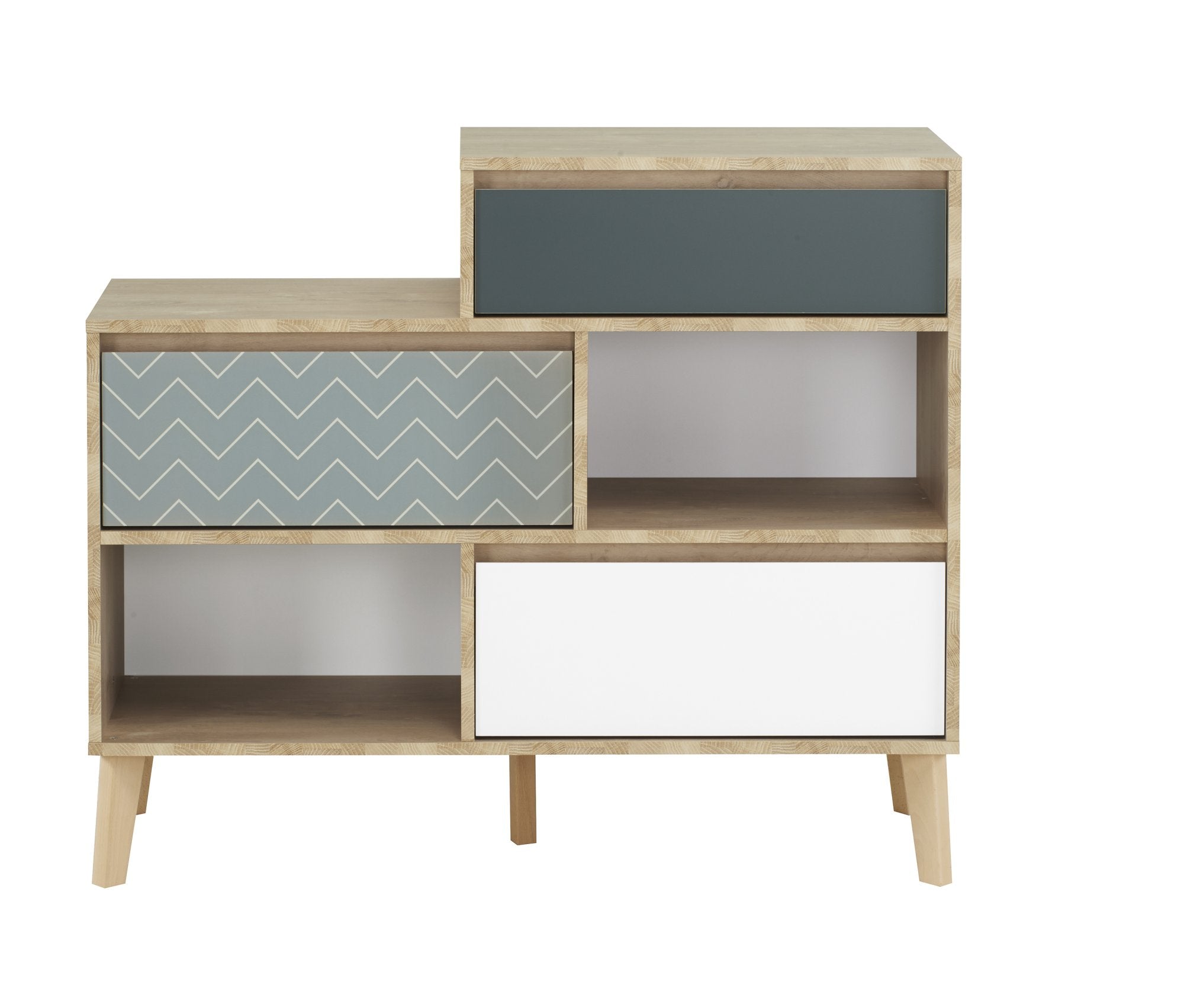 Les tiroirs supérieurs et du milieu sont ornés d'une impression numérique unique, combinant des motifs géométriques colorés et un uni vert, ajoutant une touche de modernité à votre espace. La finition en chêne blond et beige complète le design raffiné de cette commode.