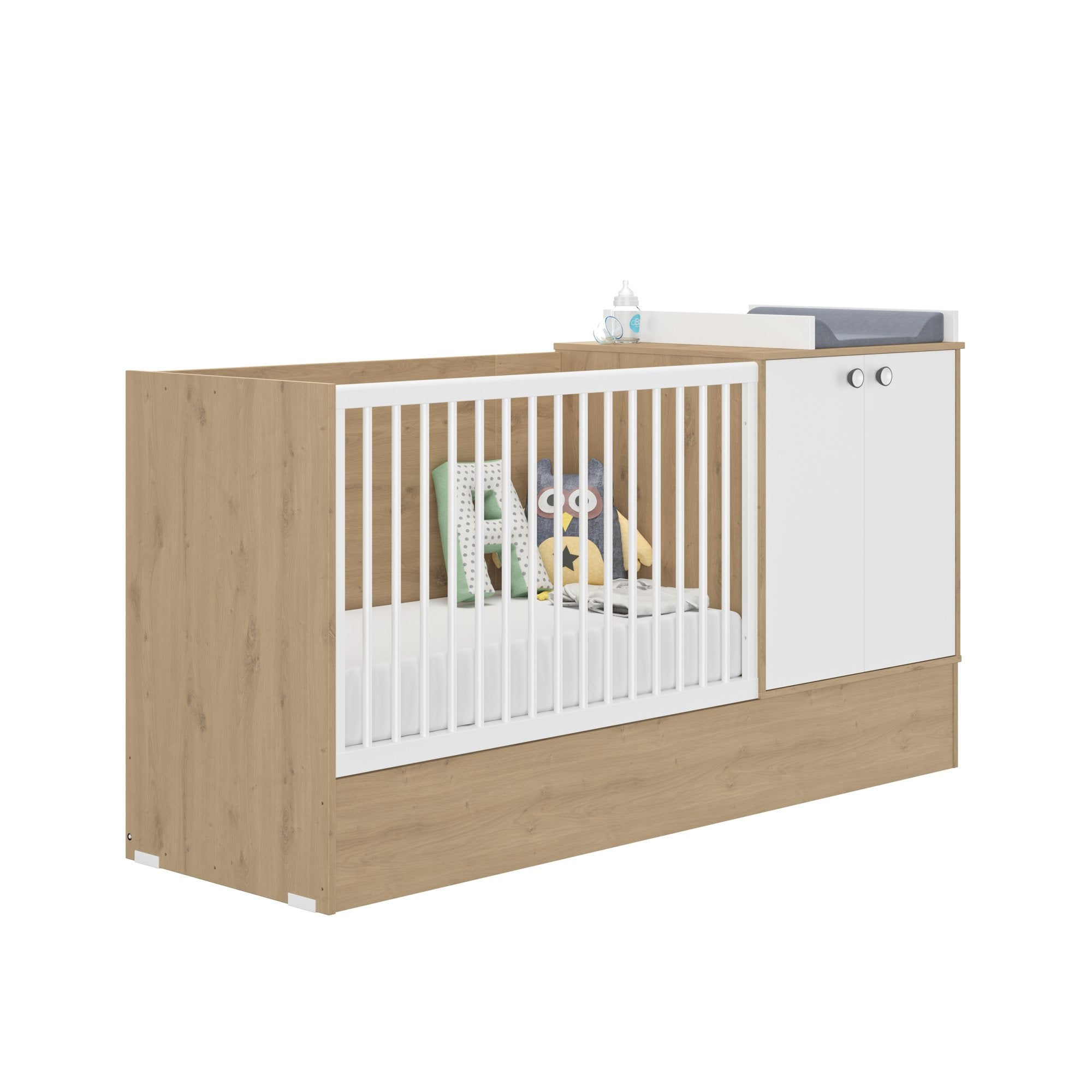 - Comprend : 1 sommier à lattes réglable 2 positions, 1 barrière blanche laque blanche, 1 rangement 2 portes (1 étagère intérieure) et 1 plan à langer