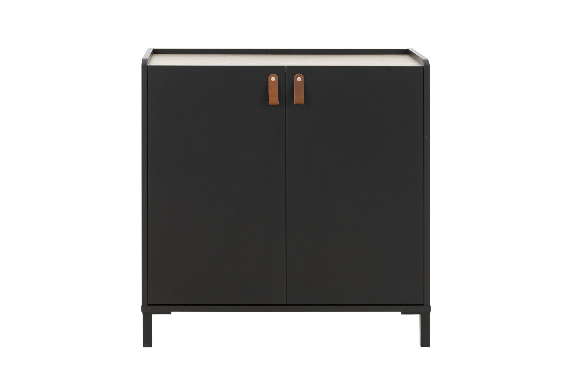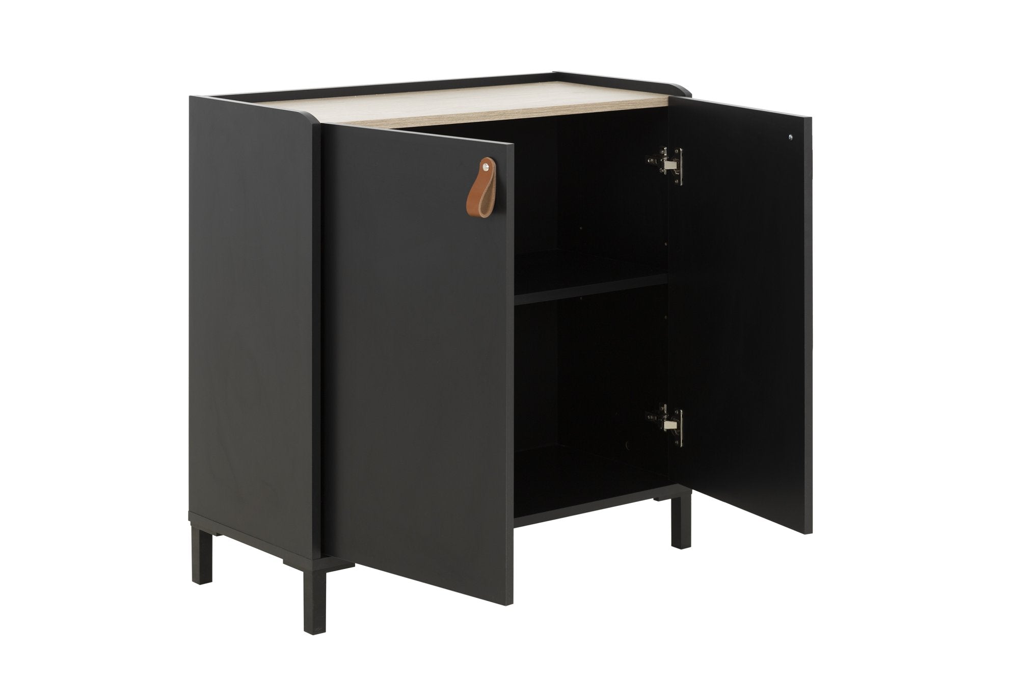 La structure et les façades sont en panneaux de particules revêtus de papier imitation Châtaignier naturel et uni Noir, offrant une esthétique moderne et raffinée. Les poignées en cuir marron ajoutent une touche de sophistication, tandis que les pieds en ABS noir mat assurent une stabilité durable.